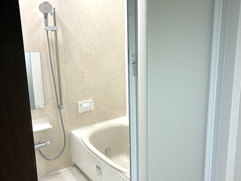 浴室のドアを引き戸に変更し、入口の開口幅を広げることで、出入りしやすい仕様にしております。